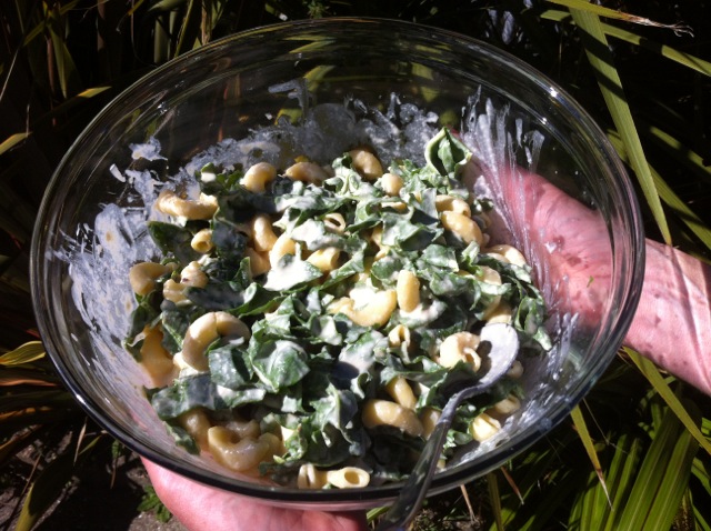 “Pour the sauce over the macaroni pasta and spinach (or Silverbeet) and mix well”.