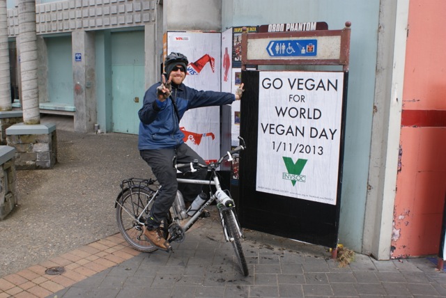 Our friend Ashlee has cycled across New Zealand. He briefly stayed at INVSOC HQ, and was glad to pose next to a World Vegan Day poster :-)