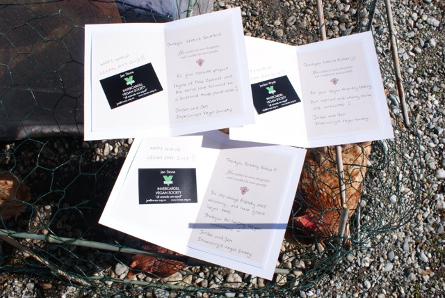 Bombay Palace are always positive to Vegans ordering (“…it’s a great thing you’re doing…”), Venture Southland are investing in Southland made Oat Milk and the Colonial Bakery have superb Vegan friendly Cherry and Apricot buns. We also gave cards to VetSouth for helping our Hen Friends and The Dentist on Kelvin for always being friendly :-)