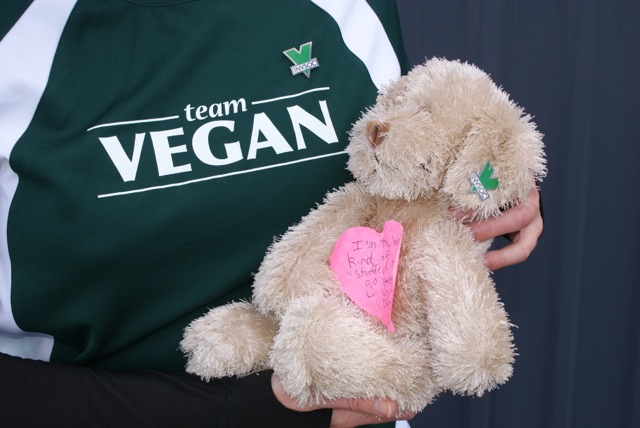 The INVSOC World Vegan Day street team gave “Animal Skin Tanning Services” a soft toy. We added a note saying “I’m the best kind of “stuffed animal”, Happy World Vegan Day!” :-)